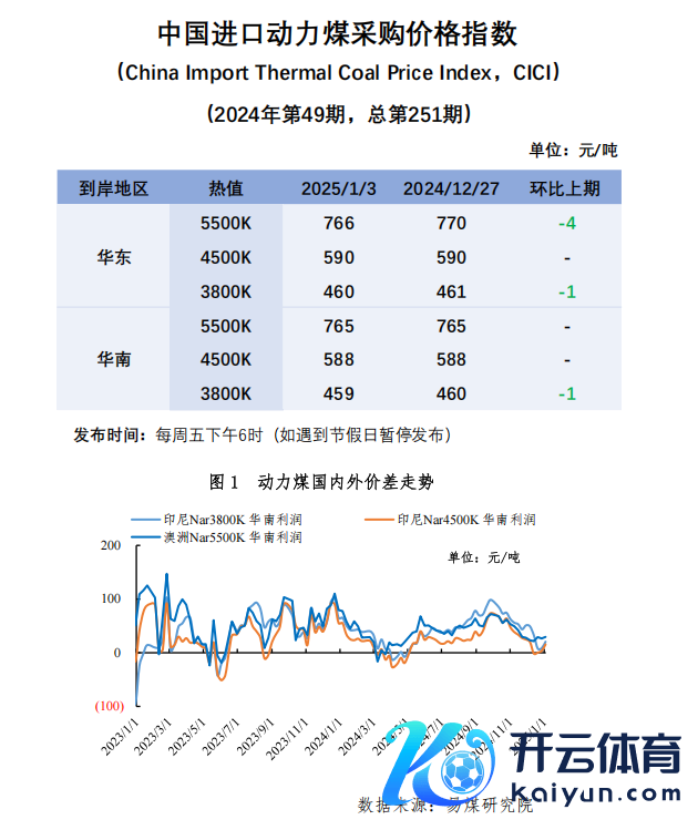 1月3日,5500K华东和华南入口能源煤采购价永别为766/吨和765元/吨,永别较上期下滑4元/吨和捏平,较国内煤价低25-30元/吨;4500K华东和华南入口能源煤采购价永别为590元/吨和588元/吨,均较上期捏平,较国内煤价低10-15元/吨;3800K华东和华南入口能源煤采购价永别为460元/吨和459元/吨,均较上期下滑1元/吨,较国内煤价低15-20元/吨。(表面测算,仅供参考)