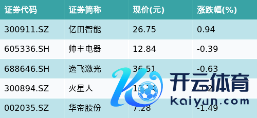 竣事收盘kai云体育app官方下载,厨卫电器主题涨跌幅最高的五只股票为:亿田智能(300911.SZ)、帅丰电器(605336.SH)、逸飞激光(688646.SH)、火星东谈主(300894.SZ)与华帝股份(002035.SZ)。细目见下表: