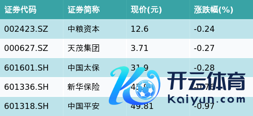 截止收盘开云kaiyun体育,保障主题涨跌幅最高的五只股票为:中粮成本(002423.SZ)、天茂集团(000627.SZ)、中国太保(601601.SH)、新华保障(601336.SH)与中国吉利(601318.SH)。细则见下表: