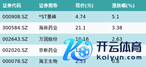 截止收盘开云kaiyun官方网站,仿制药一致性评价主题涨跌幅最高的五只股票为:*ST景峰(000908.SZ)、海辰药业(300584.SZ)、万润股份(002643.SZ)、京新药业(002020.SZ)与海王生物(000078.SZ)。信赖见下表: