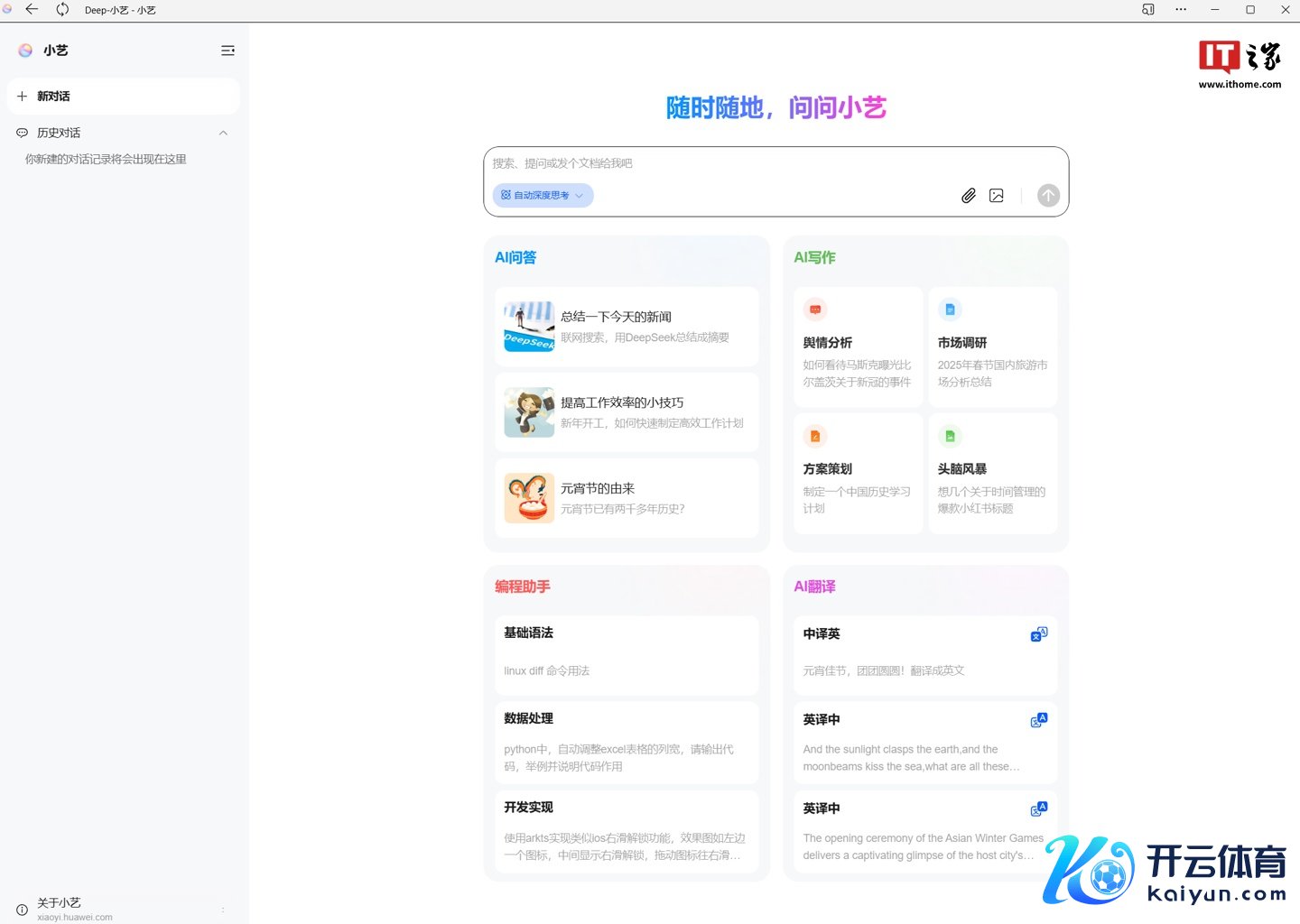 IT之家实测,现在网页版小艺智能助手已适配手机、PC 布局开云kaiyun.com,提供 AI 问答、AI 写稿、编程助手、AI 翻译等功能。另外,其还撑捏 R1 深度念念考(可自界说自动或强制)。